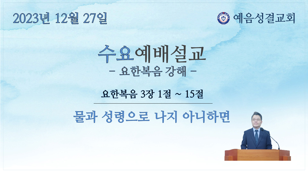 이에 예수님께서는 다시 한 번 그러나 좀 더 명확하게 말씀하셨습니다. “진실로 진실로 네게 이르노니 사람이 물과 성령으로 나지 아니하면 하나님의 나라에 들어갈 수 없느니라”(요 3:5) 성령으로 난다는 것은 성령을 받아[성령세례, 요 1:33] 새로운 생명을 얻게 되는 것을 의미합니다(행 2:38 ; 딛 3:5). 그런데 물이 무엇을 의미하는지에 대해서는 견해가 엇갈립니다. 고대로부터 많은 학자들은 물이 요한의 세례 즉 물세례를 가리키는 것으로 보고 있습니다. 물세례는 성령 세례를 통해 이루어지는 그리스도와의 연합을 상징적으로 보여주는 의식입니다(롬 6:4). 반면에 물을 성령으로 보는 학자들도 있습니다. 칼뱅은 물세례가 구원을 얻는 결정적인 요건이 되지 못하기 때문에 물은 그 다음에 언급된 성령과 같은 것으로 이해해야 한다고 주장합니다. 예수님께서도 성령을 물에 비유하신 적이 있습니다(요 7:38, 39). 또 물이 말씀을 가리킨다는 견해도 있고, 자연적인 출생을 의미한다는 주장도 있습니다. 이처럼 물이 무엇을 가리키느냐에 대한 해석상의 논쟁이 있지만 중요한 것은 ‘성령으로 거듭나야 한다’는 것이며, 그것은 예수 그리스도를 믿음으로만 가능합니다. 자신의 죄를 회개하고 예수 그리스도를 구주로 영접하는 자들은 맑은 물로 씻음같이 죄에서 정결케 되고(겔 36:25 ; 히 1:3) 성령께서 주시는 새롭고 영원한 생명을 얻게 되는 것입니다(딛 3:5-7).
