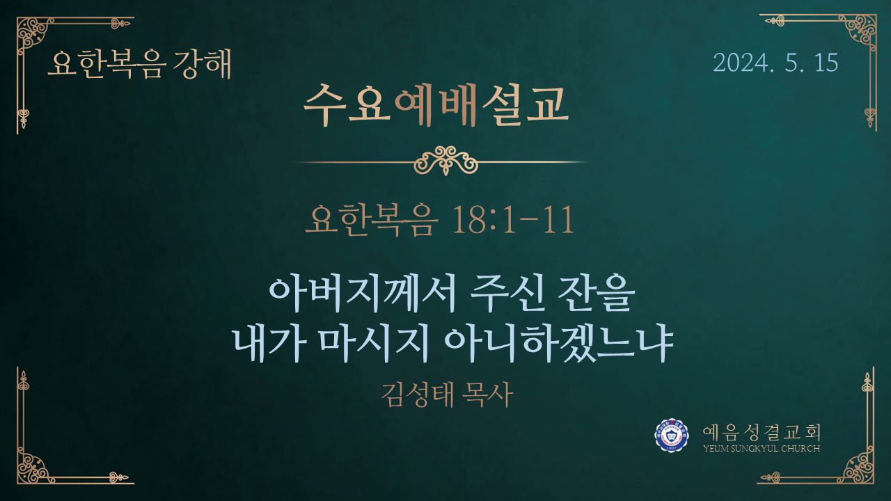 11 예수께서 베드로더러 이르시되 칼을 칼집에 꽂으라 아버지께서 주신 잔을 내가 마시지 아니하겠느냐 하시니라