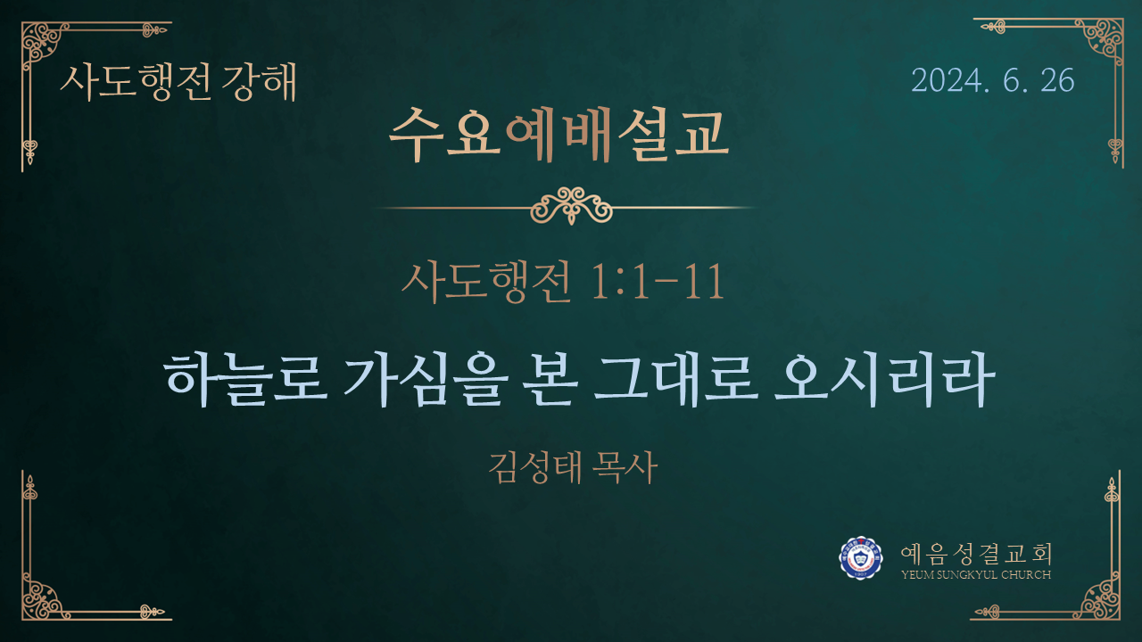 예수님께서는 부활하신 후 사십일 동안 자신이 살아 계심을 여러 가지 확실한 증거들로 사도들에게 보여 주셨고, 그들에게 하나님 나라에 관한 일들을 말씀하셨습니다. 그리고 제자들과 함께 모였을 때 그들에게 다음과 같은 명령을 하셨습니다. “예루살렘을 떠나지 말고 내게서 듣은 바 아버지께서 약속하신 것을 기다리라”(행 1:4) ‘아버지께서 약속하신 것’이란 보혜사 성령을 가리킵니다(요 14:6, 7). 그리고 ‘예루살렘을 떠나지 말라’고 하신 이유는 몇 날이 못되어 제자들이 성령으로 세례를 받게 될 것이기 때문입니다. 이 일 후에 예수님께서 승천하시기 전 마지막으로 제자들에게 나타나셨습니다. 그들이 있던 곳은 예루살렘 동편에 있는 감람원이라 하는 산이었습니다(행 1:12). 그때 제자들이 예수님께 여쭈었습니다. “주님께서 이스라엘 나라를 회복하심이 이때입니까”(행 1:8). 제자들은 예수님께서 ‘약속하신 것’에 대해 오해하고 있었던 것 같습니다. 몇 날이 못되어 성령으로 세례를 받게 될 것이라는 말씀을 이스라엘 나라가 회복될 것이라는 의미로 받아들였다는 것입니다. 부활하신 예수님께서 제자들에게 줄곧 하나님 나라에 관한 일들을 말씀하셨기 때문에(행 1:3) 그들이 오해할 만도 합니다.